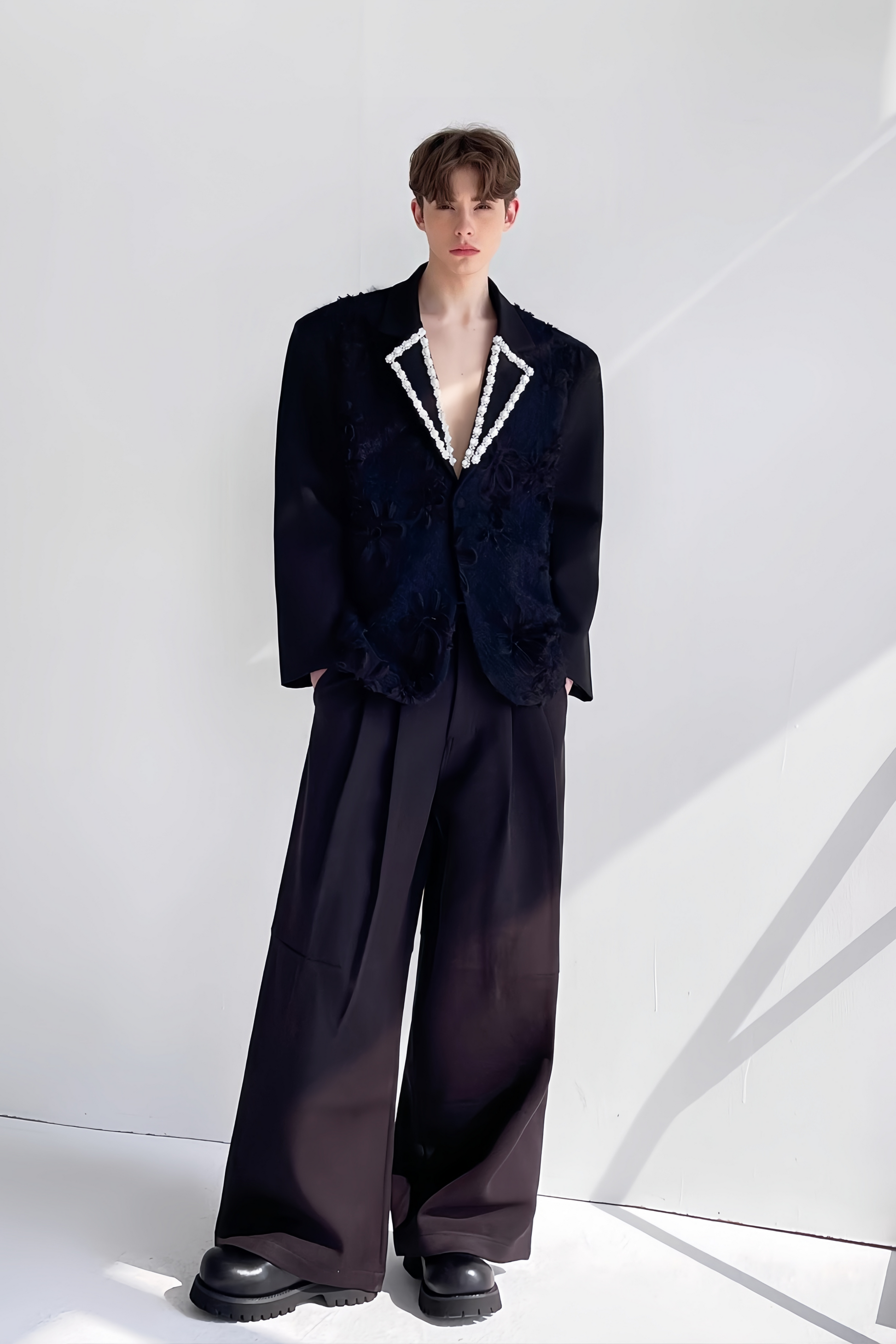 سترة أمير سوداء مزينة بزخارف زهرية من اللؤلؤ الصناعي