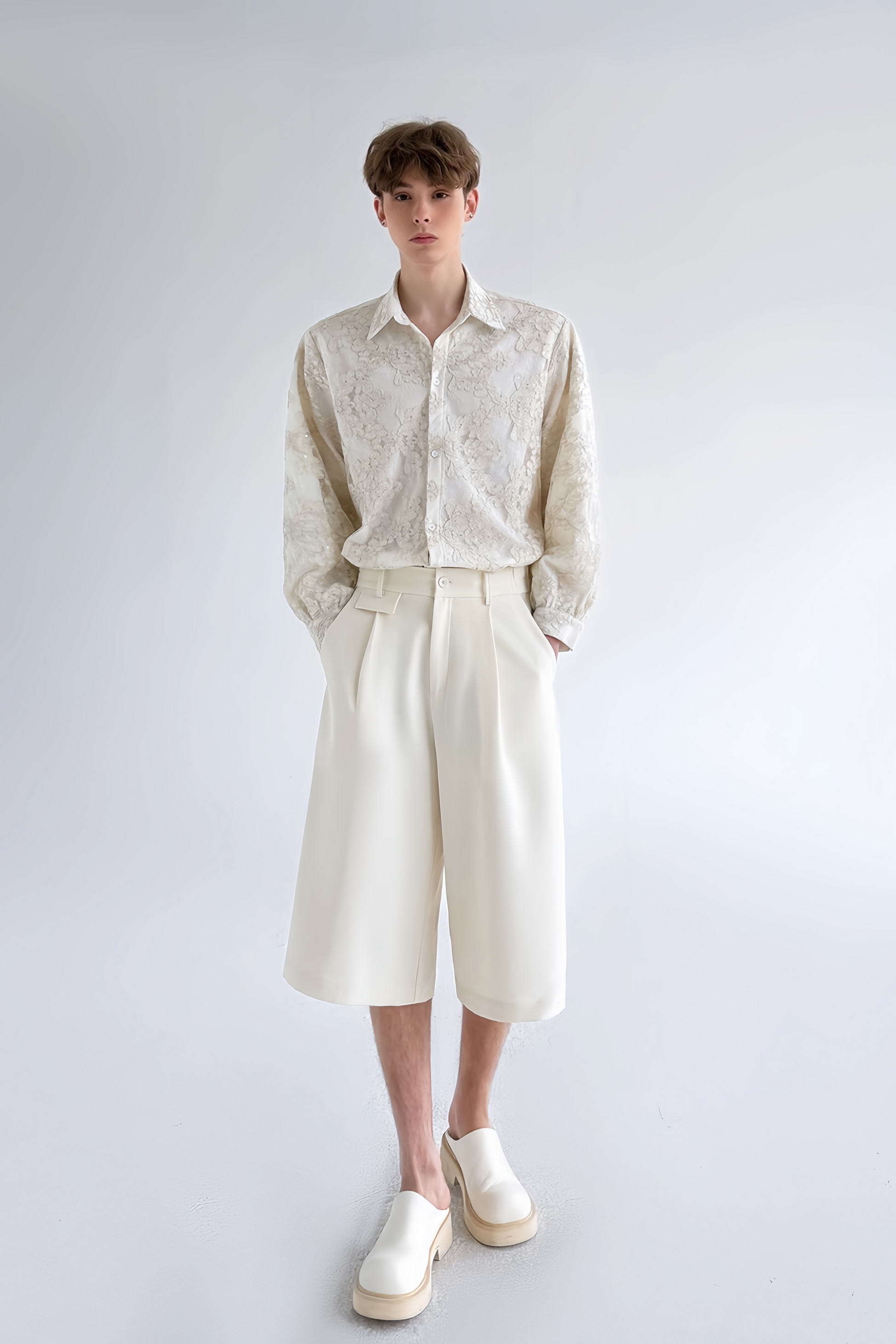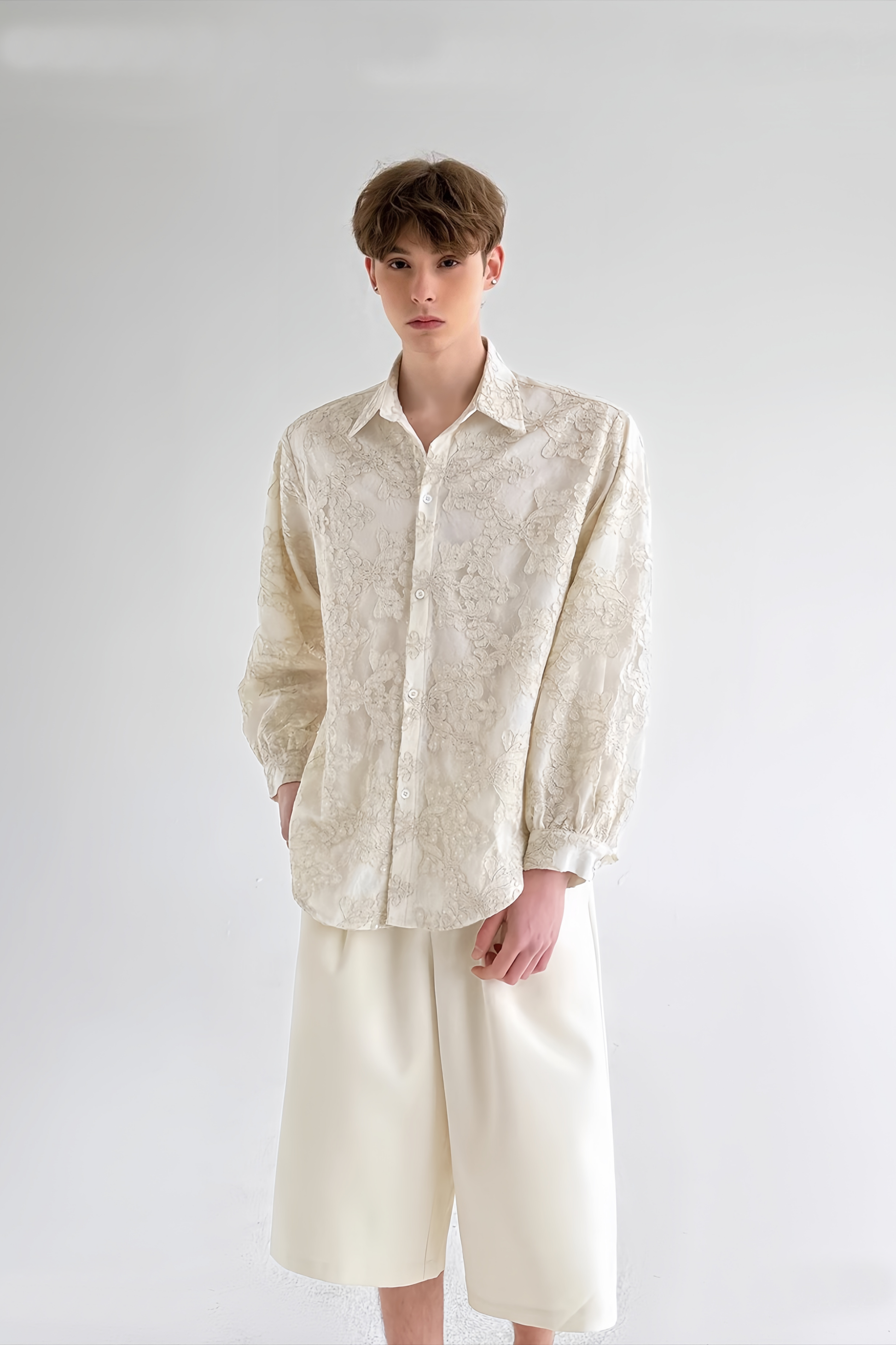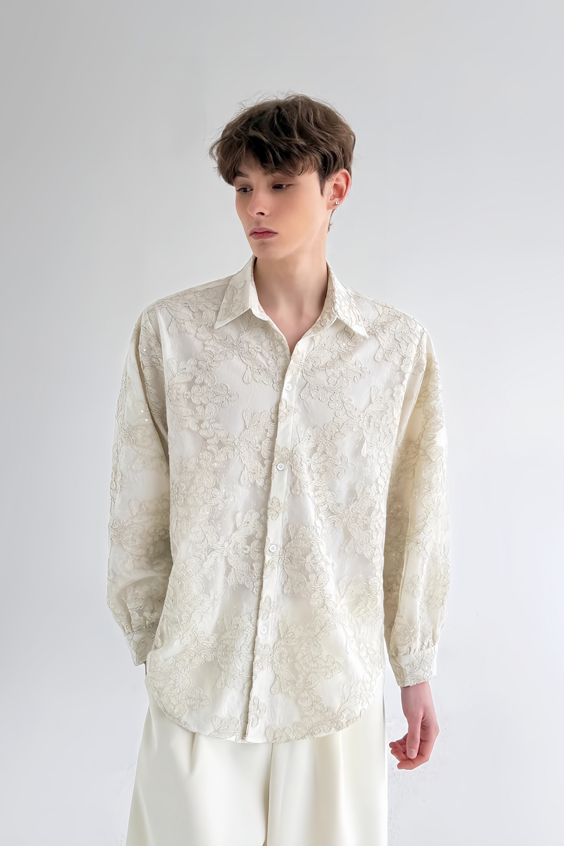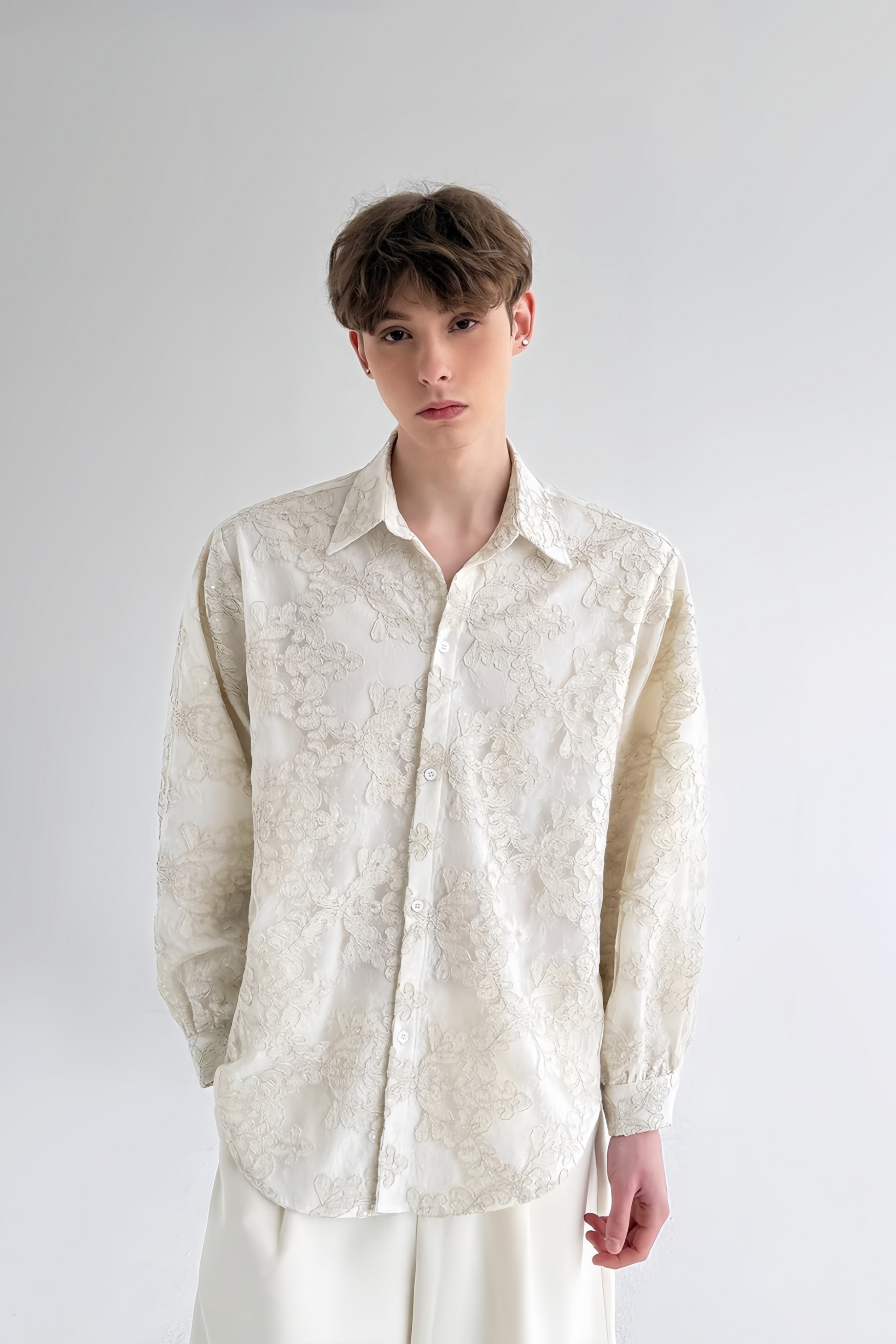 قميص أبيض طويل الأكمام من Bastien مزين بتطريزات زهرية على طبقتين